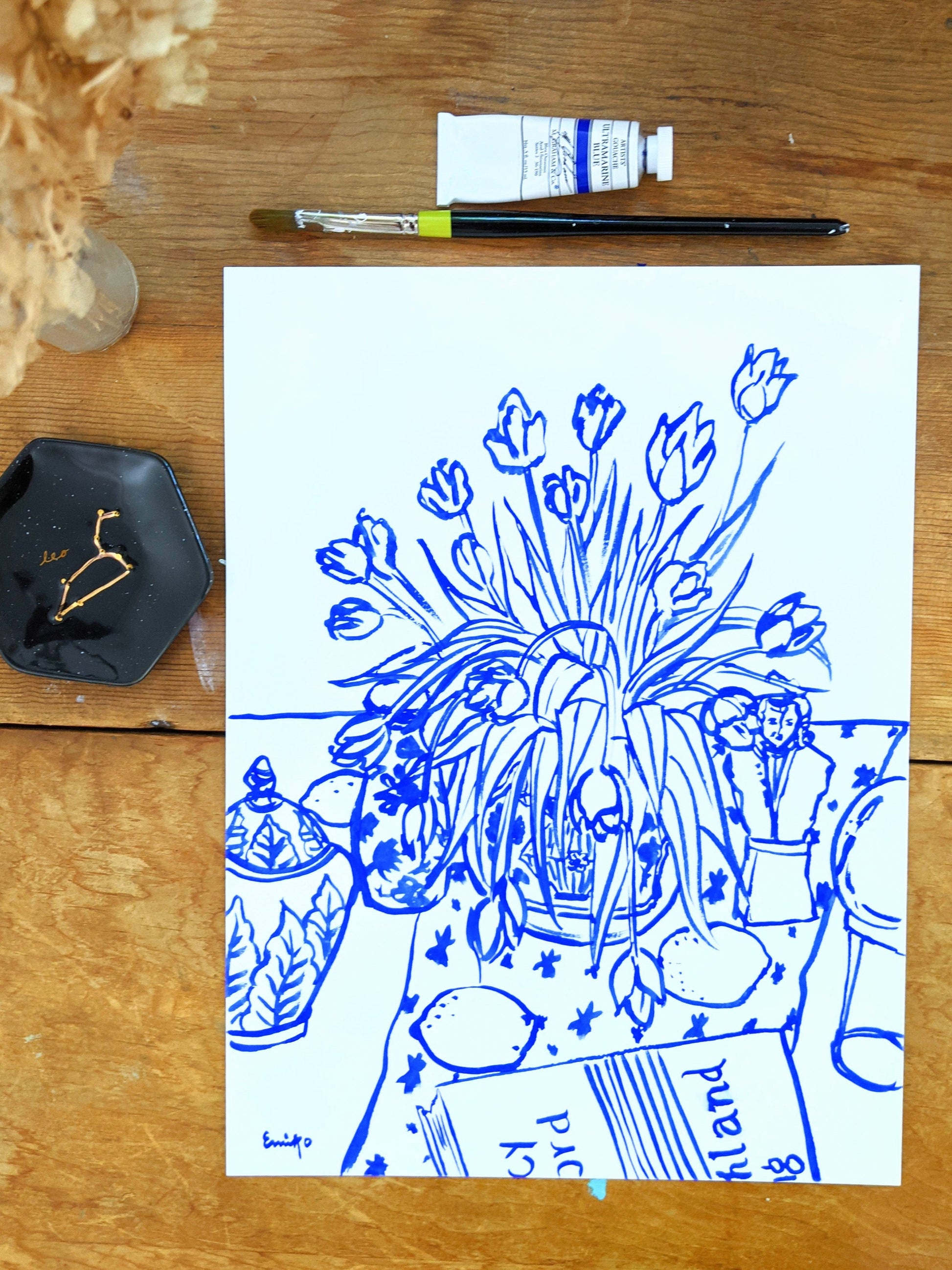 This original work is a gouache painting on 9” x 12” 300g, cold press watercolor paper.